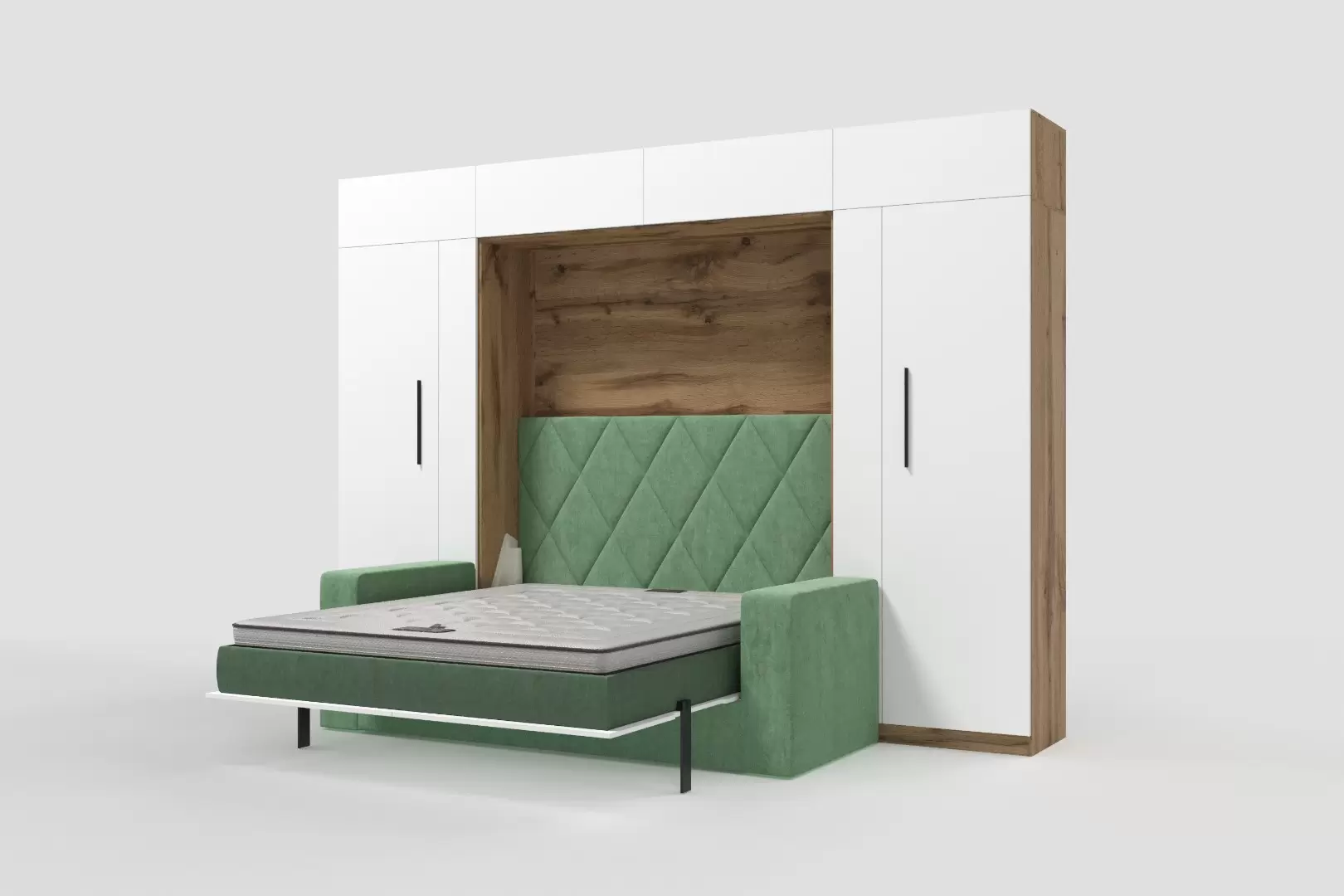 Шкаф-кровать трансформер с диваном "Deluxe platinum Balance" работает на механизме раскладывания собственной разработки "Balance". Кровать раскладывается легким движением руки, превращаясь в полноценное спальное место. Просто потяните за ножку-маятник, которая самостоятельно фиксируется в нужное положение при опускании.